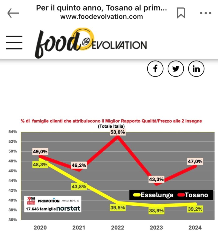 . «Nell’ultimo anno il 20% delle famiglie ha cambiato il giudizio sull’insegna con il miglior rapporto qualità/prezzo – spiega Daniele Tirelli, responsabile scientifico della ricerca – ed è arrivata al 75% la quota di coloro che alternano la Gdo classica con i cinque principali discount presenti in Italia (ossia Lidl, Aldi, Md, Penny ed Eurospin ndr)». A farne le spese sono state tutte le catene distributive (a eccezione di Conad), e in particolare Esselunga, con circa 100mila famiglie di clienti in più che nell’ultimo anno hanno iniziato a frequentare anche i discount. Ma credere che dietro queste scelte ci sia solo la ricerca di risparmio è sbagliato. Infatti quasi due clienti su tre scelgono le insegne per motivi diversi dal rapporto qualità prezzo. Contano lo scenario concorrenziale locale, così come la qualità dei prodotti e dei reparti. Tra questi ultimi l’ortofrutta resta il più importante (57% delle famiglie) …