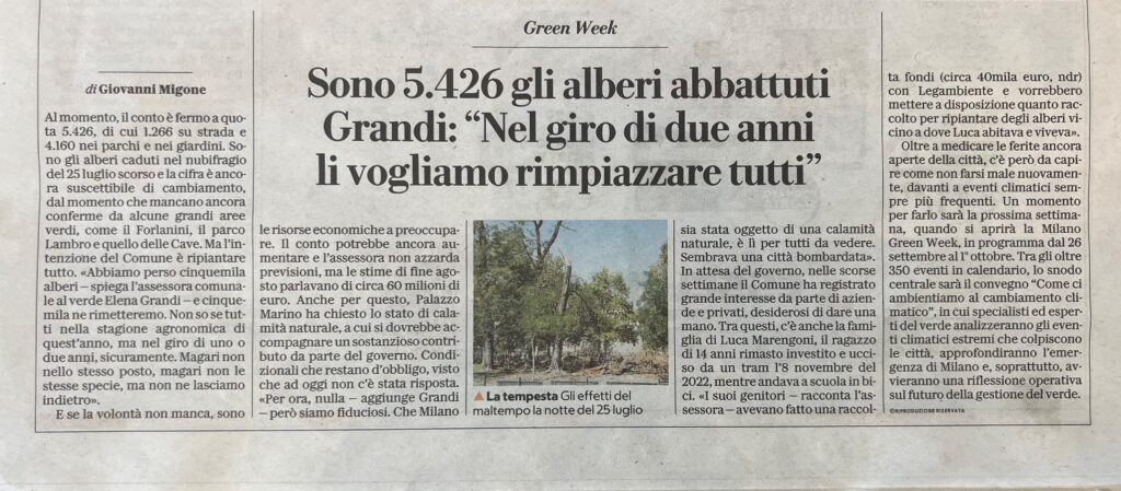 Fonte per Roma. A Milano gli alberi abbattuti a causa del cambiamento climatico e delle tempeste del 2023 sono stati più di 5000 (vedi anche sotto il Corriere di luglio 2023). Nella foto : uno dei tanti alberi caduti quest’anno ad Albiate
