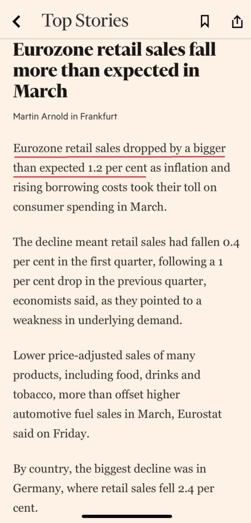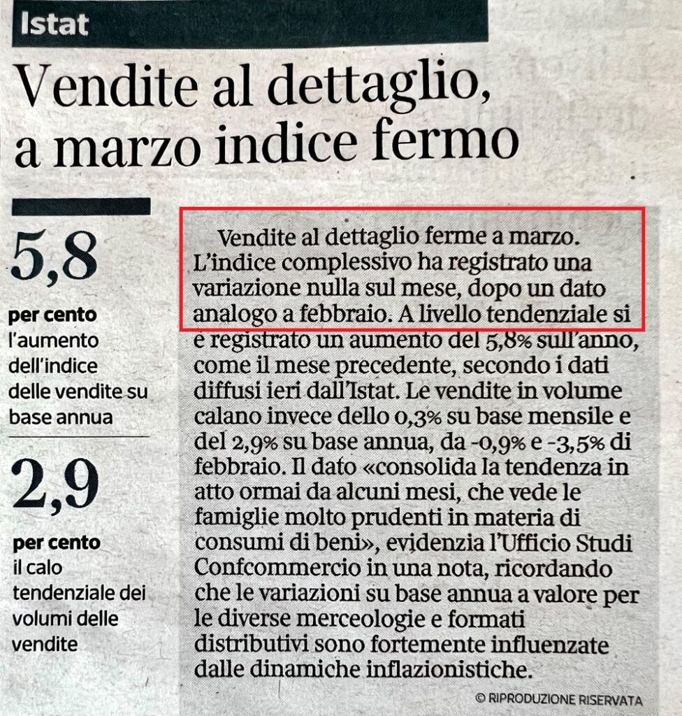 FT e Corriere della Sera (6 maggio 2023). Il calo delle vendite – a volume – in Italia ha superato il 5% (febbraio 2023).