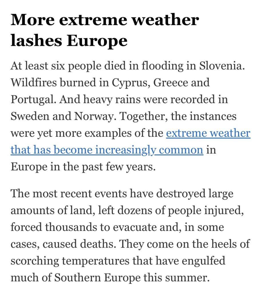 Diluvi in Cina, caldo record in Sud America e Iran. Innondazioni e piogge molto forti in Slovenia, Norvegia e Svezia. Incendi in Sardegna a Cipro , in Grecia e in Portogallo. Inferno alle Hawaii: l’uragano Dora soffia sugli incendi: almeno sei morti. (il bilancio è si aggrava di ora in ora, i morti dovrebbero essere più di 50). ma la cosa più impressionante è il riscaldamento del mare: temperature record per oceani e mari, da aprile in poi. Fonti: Le Monde, Corriere della Sera Repubblica e New York Times