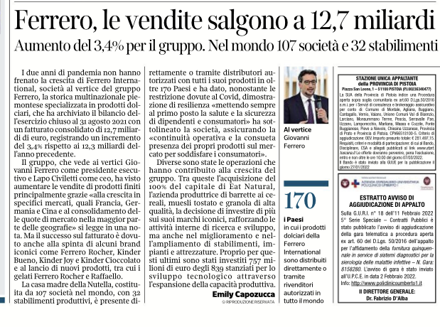Ferrero vendite a 12,7 miliardi