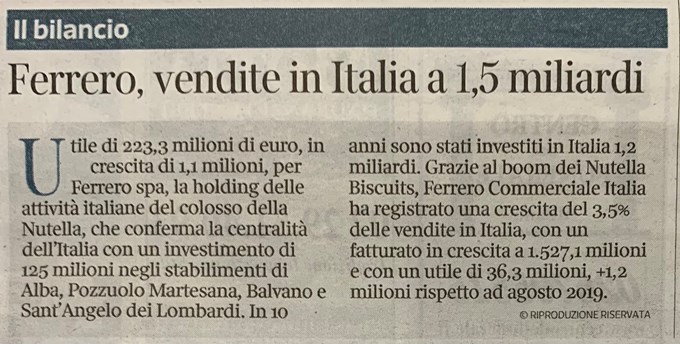 Ferrero: vendite a 1,5 miliardi in Italia grazie ai Nutella Biscuits