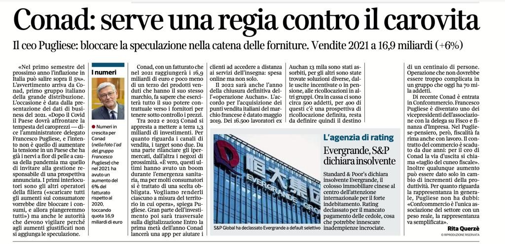“Dopo il Covid il Paese dovrà affrontare la tempesta del caroprezzi” Francesco Pugliese al Corriere della Sera del 18 dicembre 2021.