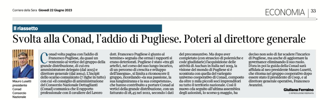 Mark- Up 21 giugno 2023. La maggioranza dei soci ha optato per una transizione “morbida”, cercando di evitare un possibile scandalo. In quest’ottica è stato proposto Mauro Lusetti, uomo Conad ed ex presidente Legacoop, al posto di Pugliese.