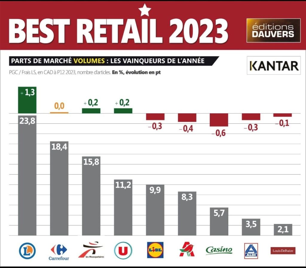 I supermercati e gli ipermercati sono in zone complementari (sud, essenzialmente) a quelle coperte attualmente (nord della Francia). LSA . Auchan spera di salvarsi con questa acquisizione : oltre a Casino è l’azienda che ha perso più quote di mercato in Francia nel 2023 (fonte : Dauvers). Anche i discount Lidl e Aldi sono “in discesa”. Unico vincitore : Leclerc.