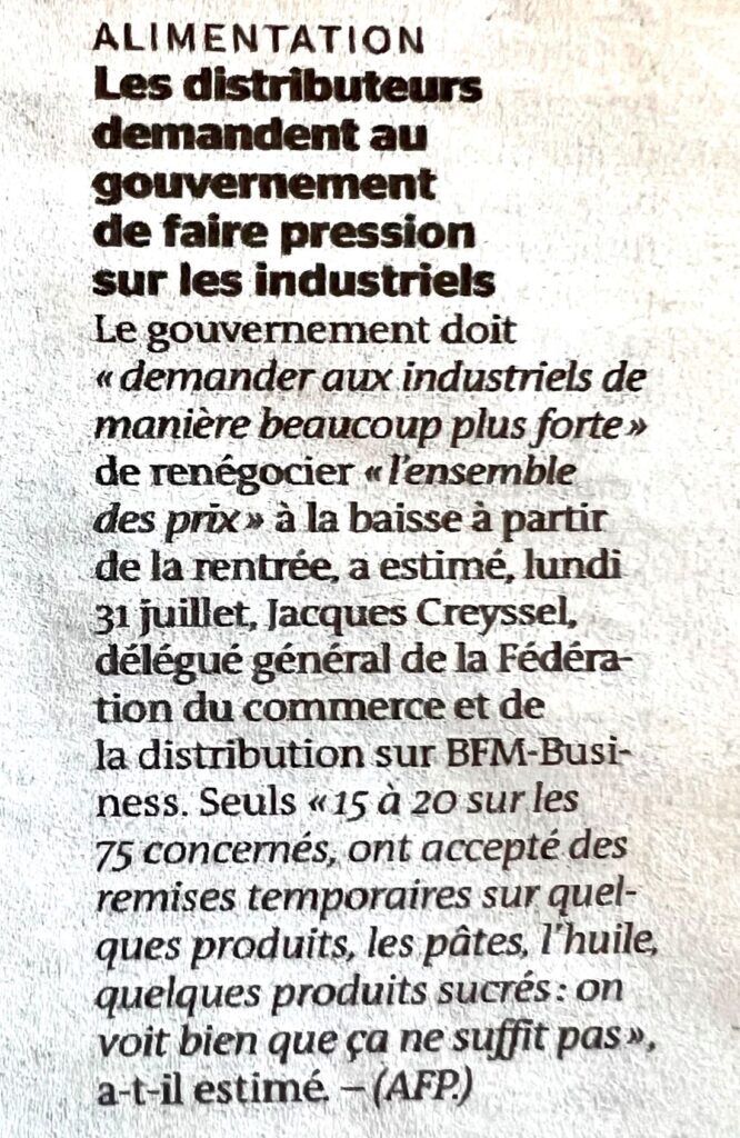 la GDO francese preme sul governo perchhè faccia calare i listini dell’industria: solo 15-20 su 75 aziende dell’IDM francese hanno accettato di fare delle promozioni. Le Monde 2 agosto 2023. Leggi questo articolo