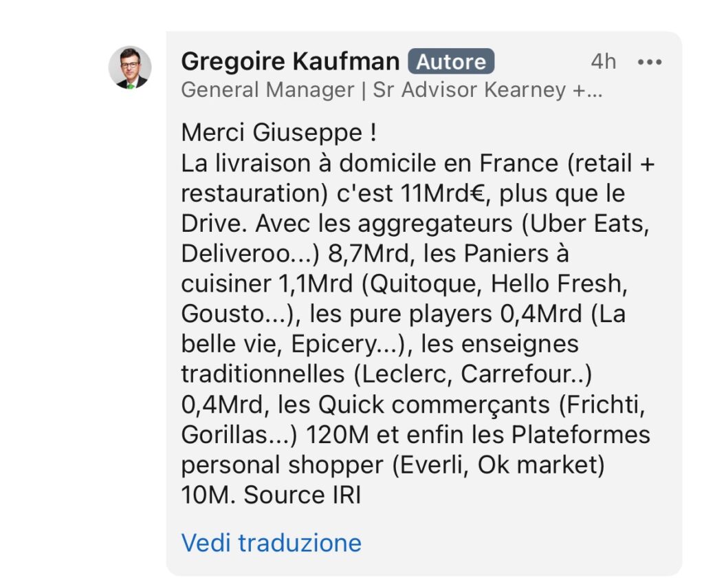 “Le Drive, longtemps spécificité bien française a séduit 32% (*) des foyers (**) en 2021. La livraison à domicile suit derrière avec 9%, le Drive Piéton 3%”. Gregoire Kaufman LSA.
