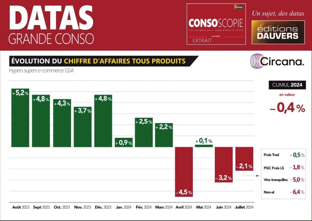 Trattasi di dati annuali Cicana (ex IRI) su ipermercati, supermercati e e-commerce. E’ la prima volta dopo tre anni. L’INSEE- equivalente dell’Istat – ha confermato