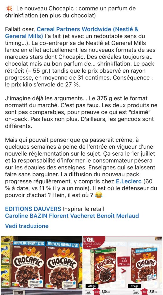 Oliver Dauvers evidenzia come la shrinkinflation sia ormai un’arma di marketing. In questo lancio il prezzo al kg. mette a segno un + 27%