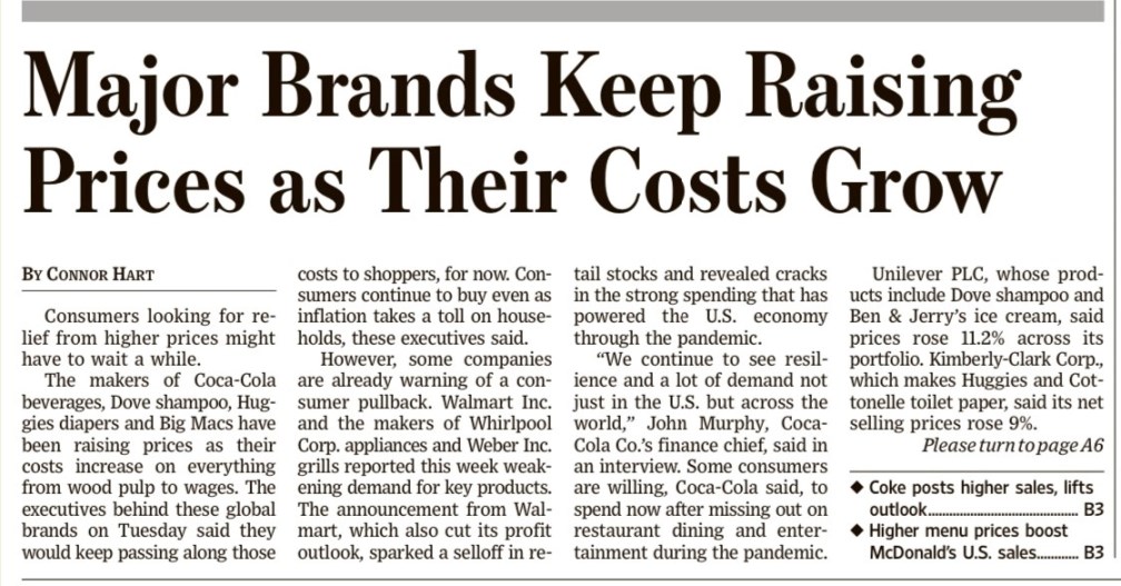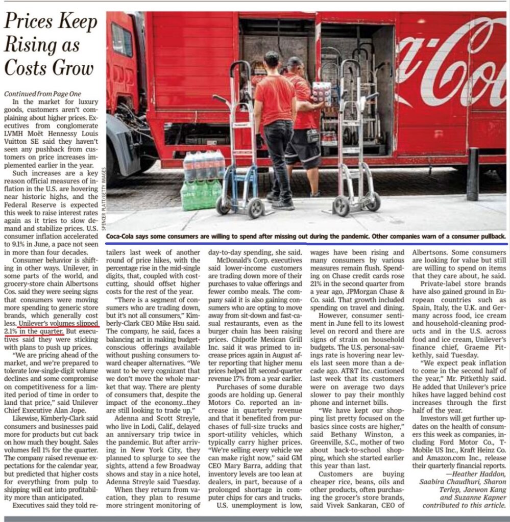 Se Coca-Cola vede segnali contrastanti: trading down ma anche voglia di spendere , a causa dell’uscita dal Covid, il fatturato di Unilever è sceso (- 2,1%). Tutti pensano che la corsa dell’inflazione non si arresterà. Wall Street Journal 17 luglio 2022