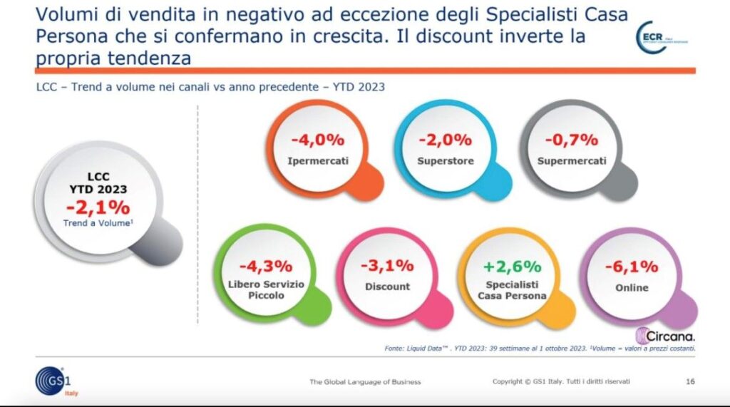 su 39 settimane al 1° ottobre 2023. I discount a – 3,1%, i superstore a – 2% . L’e-commerce va malissimo : – 6,1%