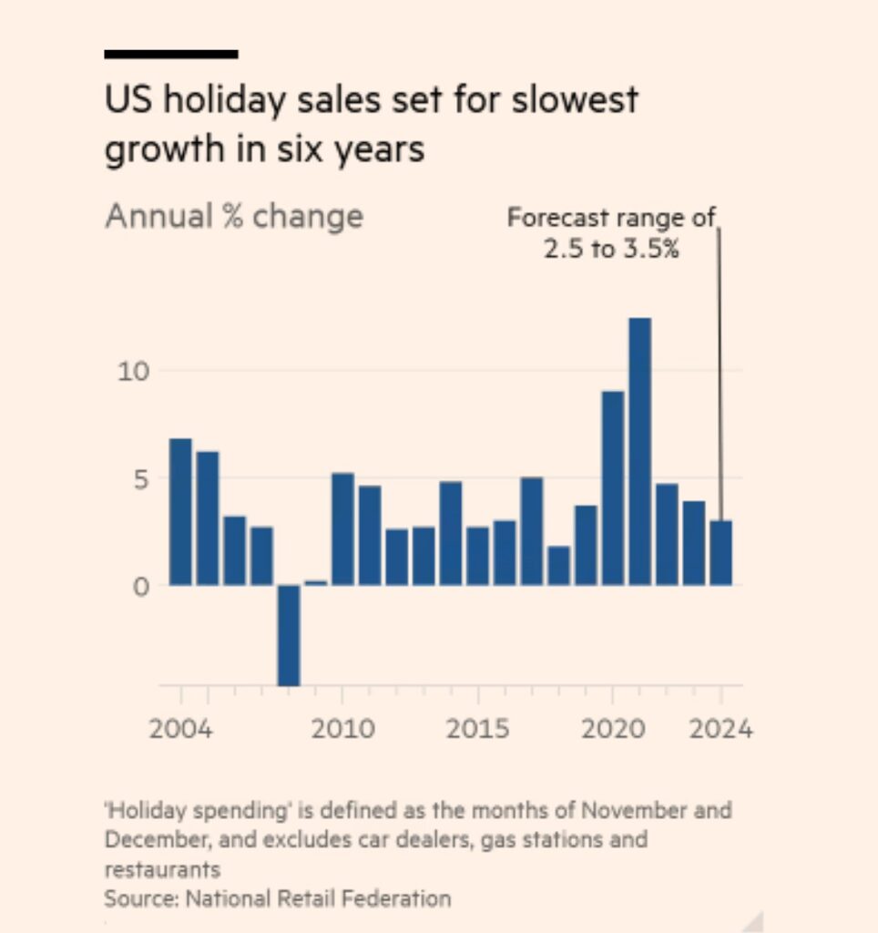 Walmart, Amazon, Target e Macy’s sono tra i rivenditori statunitensi che già offrono forti sconti sotto l’insegna del Black Friday, molto prima che arrivi effettivamente questa settimana. Nonostante ciò, le vendite di unità di non food sono diminuite del 3% su base annua nella settimana terminata il 16 novembre, secondo i dati di Circana, che compila i dati dei punti vendita al dettaglio. La National Retail Federation prevede che le vendite per le vacanze invernali raggiungeranno quasi 1 trilione di dollari negli Stati Uniti a novembre e dicembre, un record di 902 dollari a testa. Ma il tasso di crescita della spesa dovrebbe essere di circa il 2,5-3,5%, il più lento dal 2018