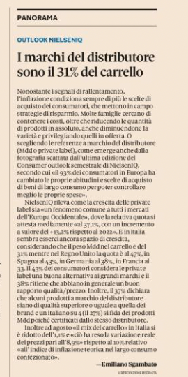 In Europa le private label sono al 37,1%. Costando meno delle grandi marche il loro incremento di quota ha un effetto deflattivo. Il Sole 24 ore del 7 ottobre 2023