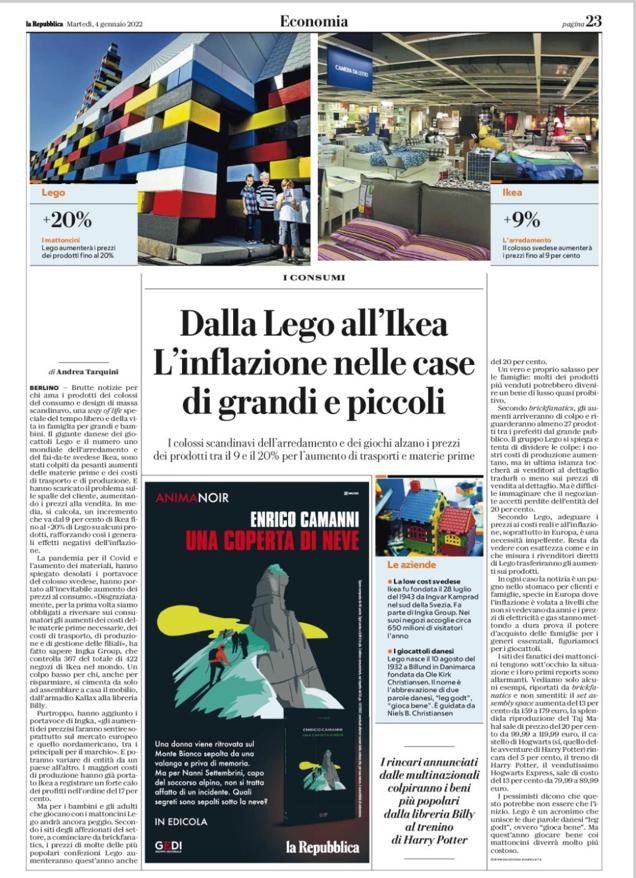 dal 9% al 20%. . Inflazione causata da problemi approvvigionamento e trasporti. Repubblica 4 gennaio 2022