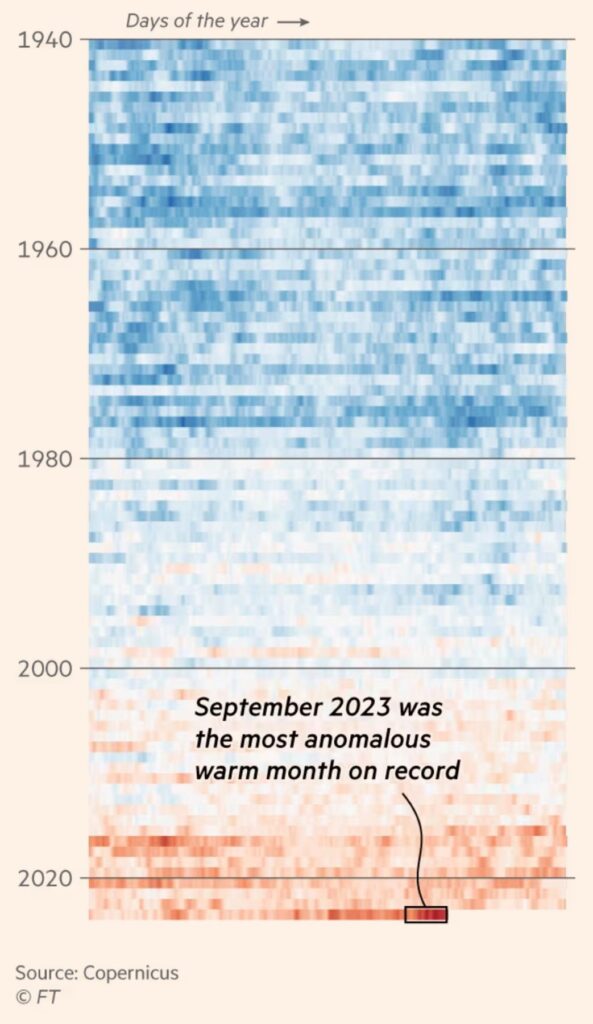 Gli scienziati del Copernicus Climate Change Service hanno affermato che il 2023 è sulla buona strada per essere il più caldo mai registrato, dopo che la temperatura media globale a settembre è stata di 1,75 gradi centigradi più calda rispetto al periodo preindustriale del 1850-1900, prima che i cambiamenti climatici indotti dall’uomo iniziassero a fare effetto. FT