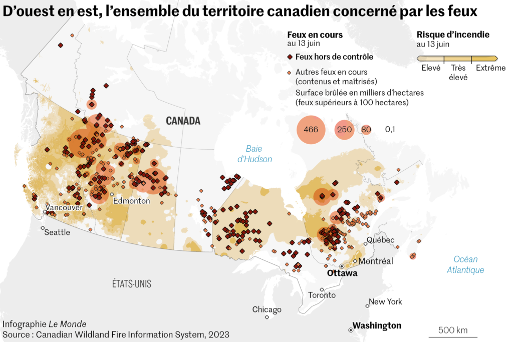449 incendi attivi, dei quali 226 “fuori controllo” per 5 milioni di ettari bruciati fino ad adesso. Le Monde 14 giugno 2023.