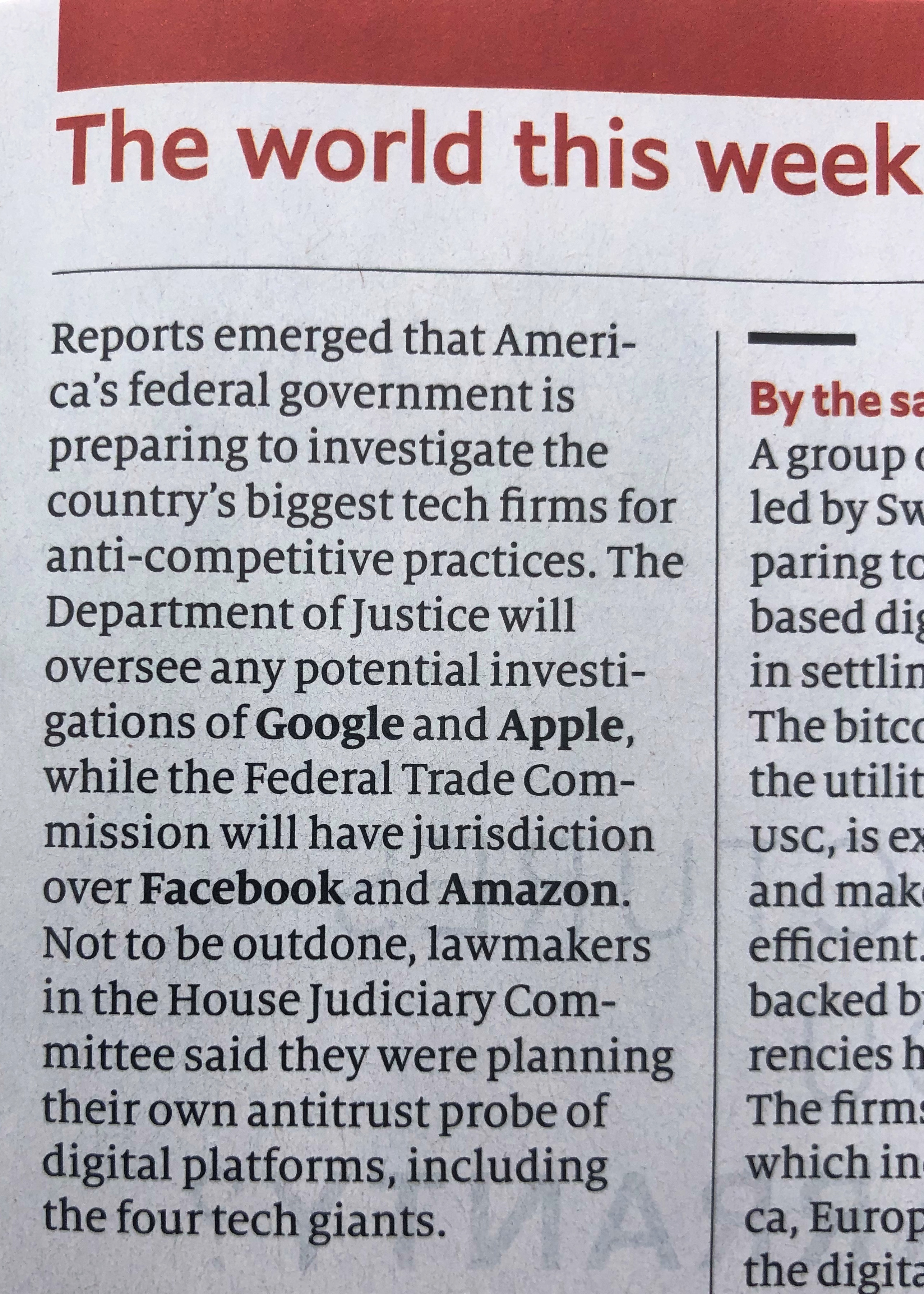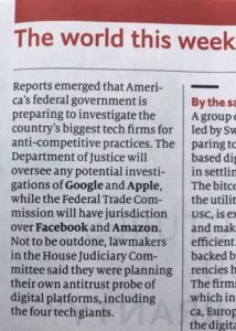 che riguarda le pratiche monopolistiche di Facebook, Amazon, Apple e Google. Indagherà , fungendo da antitrust, la Federal Trade Commission. Le Monde del 23 Luglio 2019.