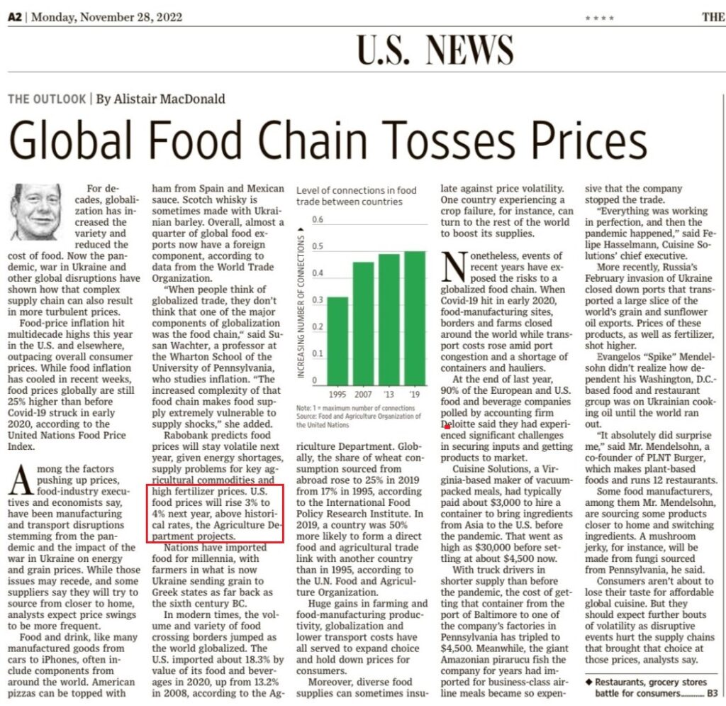 I prezzi delle materie prime sono ancora più alti del 25% rispetto al pre Covid – 19 (fonte : ONU). The Wall Street Journal 28 novembre 2022