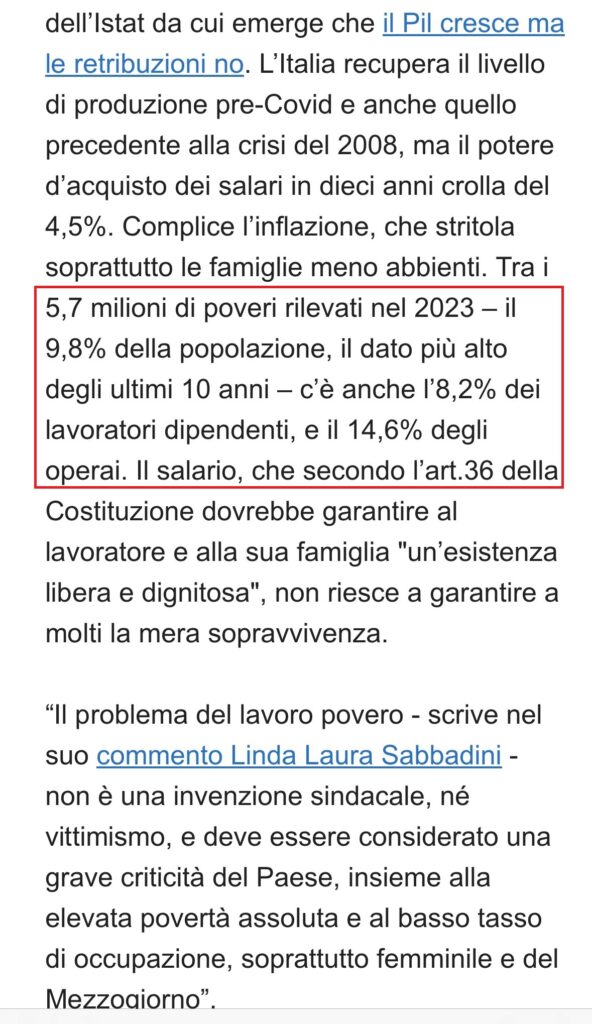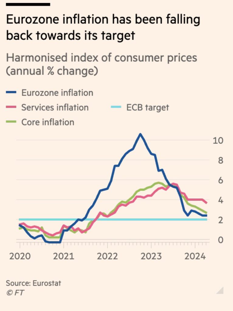 E quindi l’Italia, certifica il Rapporto Annuale Istat 2024, riesce a recuperare il livello di produzione pre-Covid e anche quello precedente alla crisi del 2008, ma il potere d’acquisto dei salari in dieci anni crolla del 4,5%. Complice l’inflazione che stritola le famiglie meno abbienti ma anche una totale assenza di una politica di stimolo dei consumi, che valgono ormai il 58% del PIL. Il paniere dei prezzi del ministro Urso ha consistito in mera propaganda. La GDO non ha purtroppo fatto molto meglio della politica. La notizia buona è che l’inflazione sta scendendo al 2,5% (la seconda chart è del Financial Times, 15 maggio 2024). Redatto il 15 maggio, aggiornato il 17 maggio 2024
