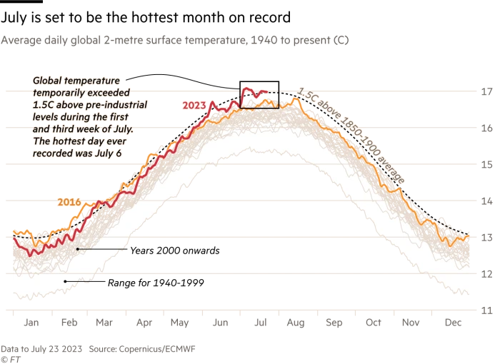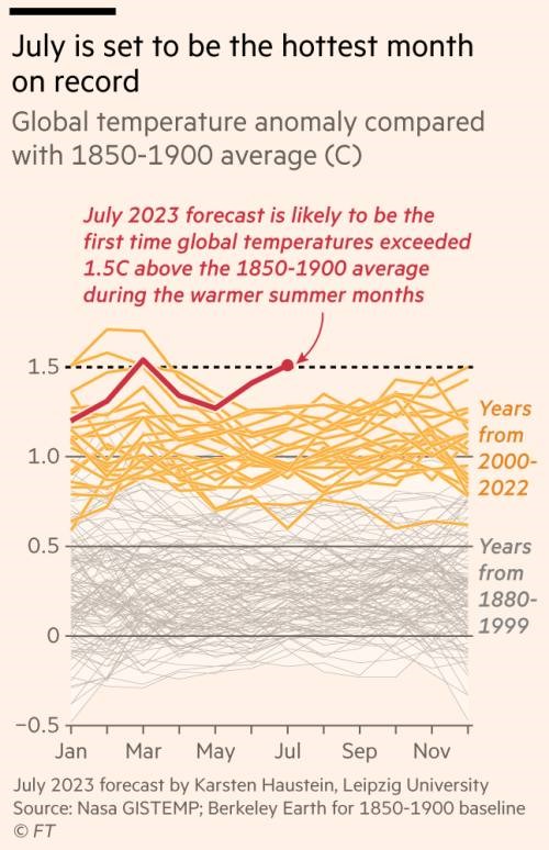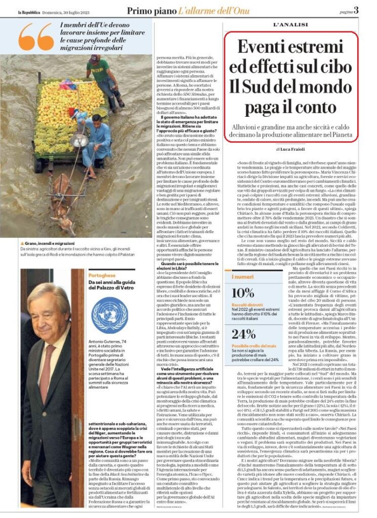 The World Weather Attribution academic research group, the leading authority on analysis of links between weather and global warming, said last week that the latest heatwaves were “virtually impossible without climate change” (le ultime ondate di calore sarebbero state impossibili senza il cambiamento climatico). FT 27 luglio 2023 . Redatto il 27 luglio, aggiornato il 31 luglio 2023. Gli effetti sul cibo.