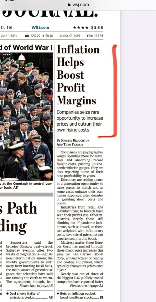 “Companies seize rare opportunity to increase prices and outrun their own rising costs” (Le aziende colgono la rara opportunità di incrementare i prezzi ed oltrepassare i loro costi crescenti: un Dejà Vu , come al tempo del passaggio all’euro.)