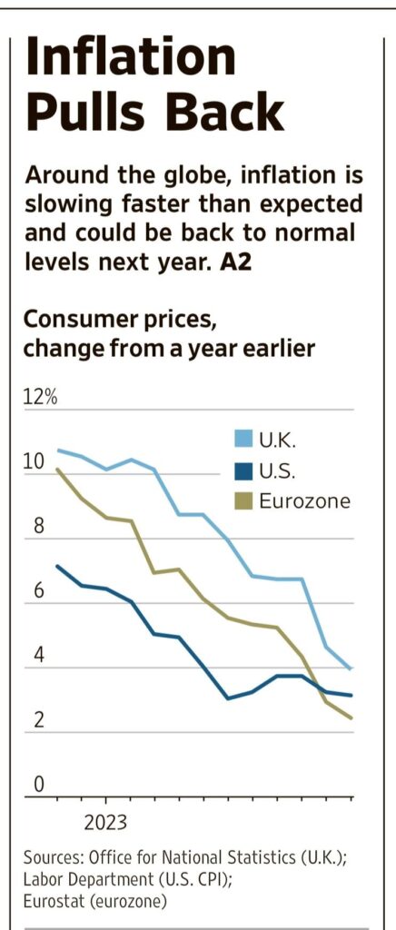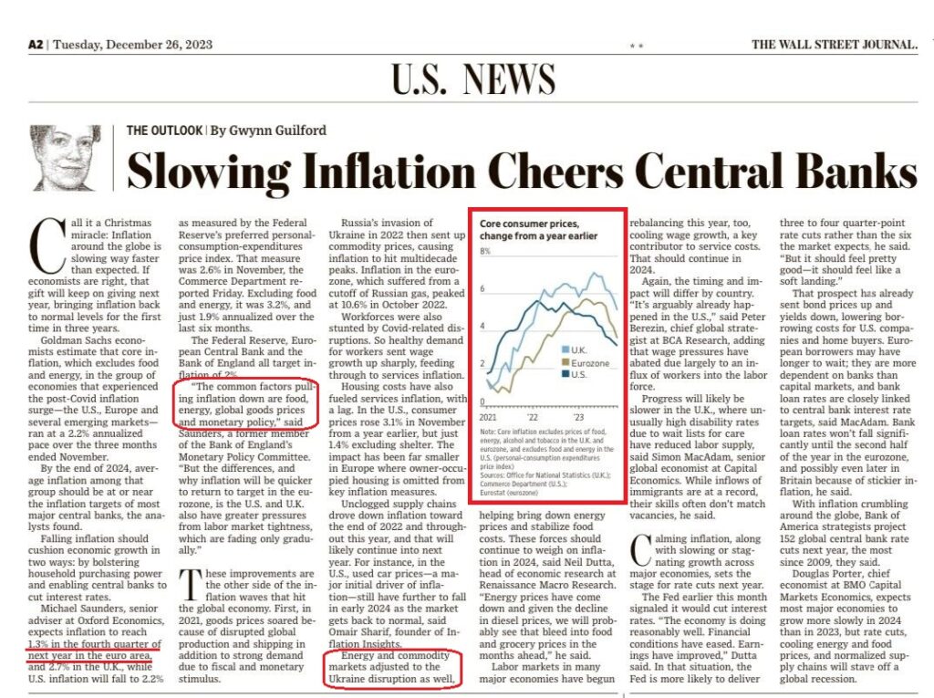 C’è chi prevede un abbassamento all’1,3% nell’ultimo trimestre del 2023, in Eurozona. I prezzi dell’energia e del cibo la stanno trscinando verso il basso. WSJ 26 dicembre 2023