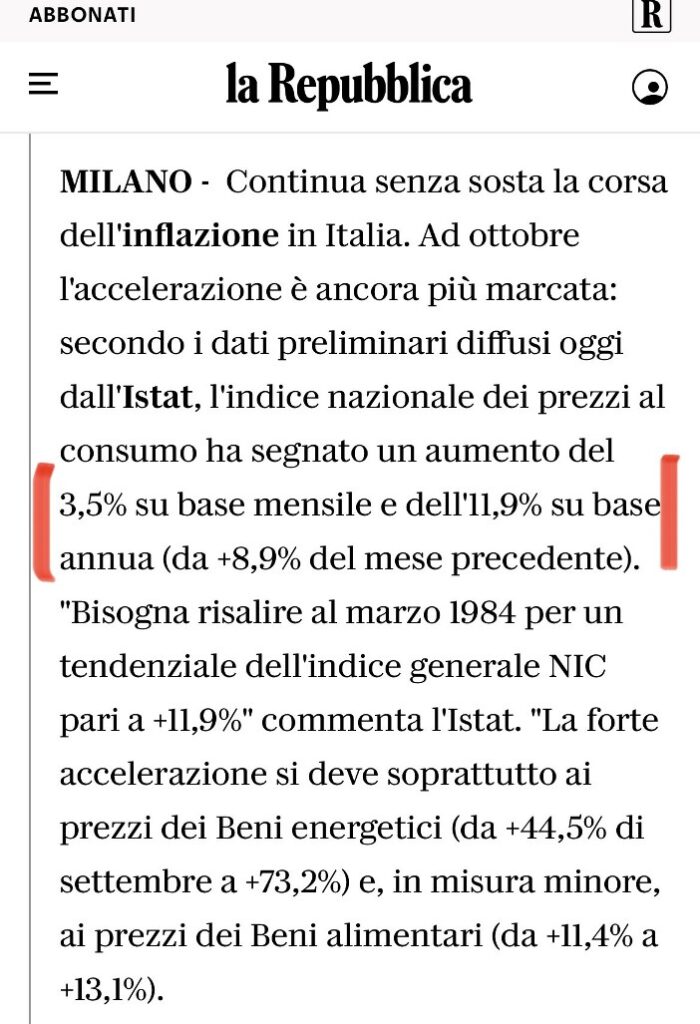 Italia : balzo in avanti dell’inflazione, all’11,9%