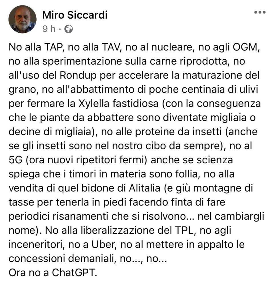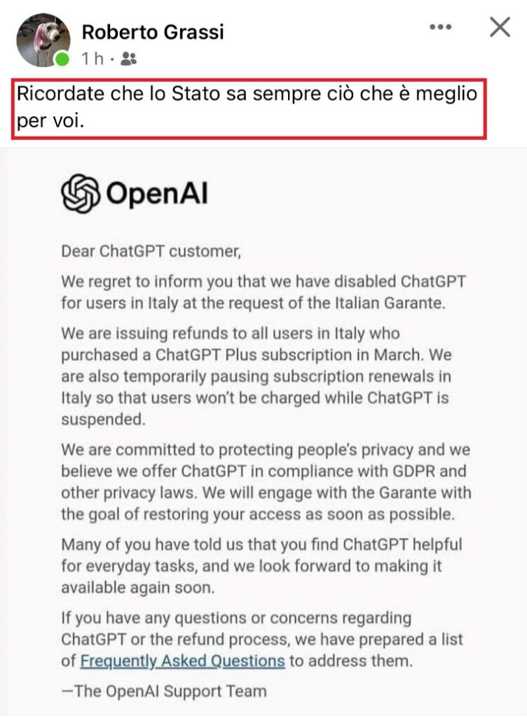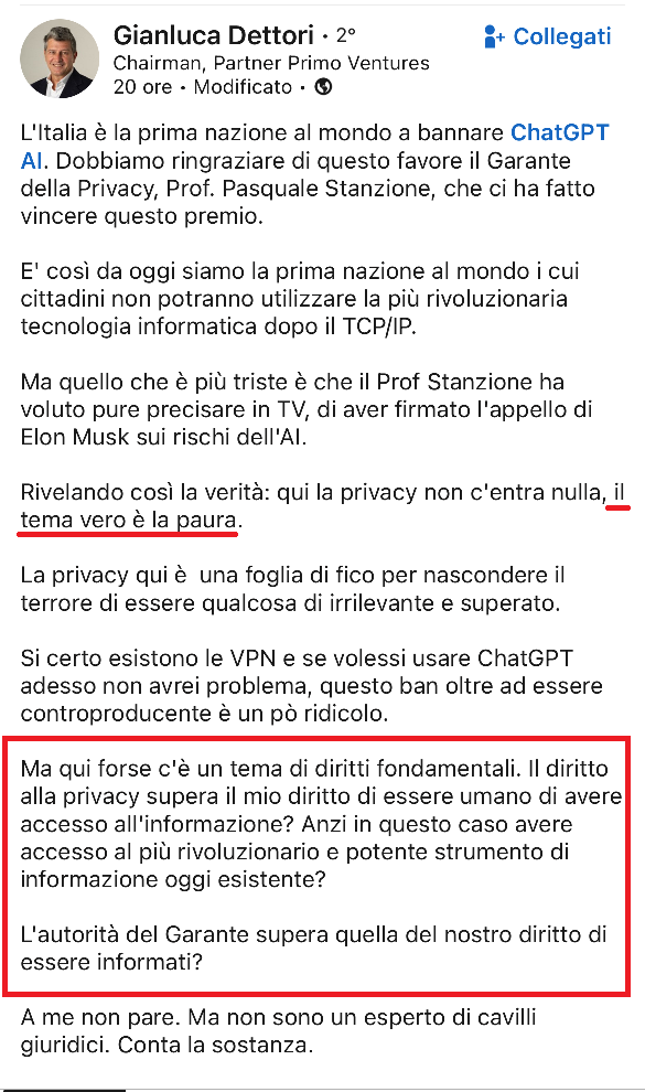 lo ha deciso il Garante per la protezione dei dati personali FT 31 marzo 2023 Open AI ha deciso di chiudere ChatGPTin Italia (la vicenda è stata definita un “pasticcio all’italiana” da Vincenzo Cosenza).
