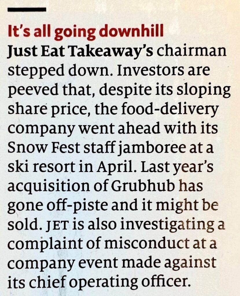 Poi se guardi The Economist – sotto – “scopri” che il titolo è in discesa perchè – al di là dei piccoli scandali sciistici – il gruppo non sta andando bene a causa della sua acquisizione di Grubhub.