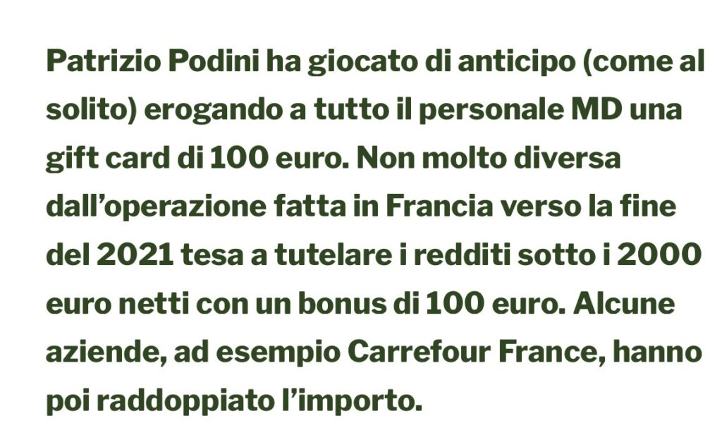 La MD del cav. Patrizio Podini eroga 100 € ai dipendenti per far fronte alle difficoltà del momento