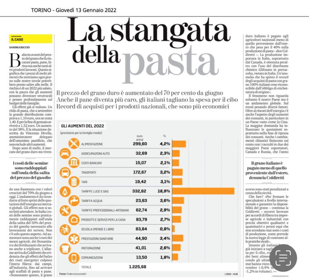 Leggi anche questo articolo : Allarme pasta (e non solo), rischio scaffali vuoti da inizio 2022 e prezzi alle stelle