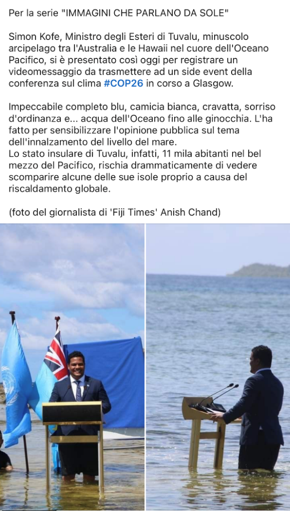 Fonte. E Simon Kofe, ministro delle Tuvalu, stato insulare polinesiano, durante la COP26, ha lanciato un appello originale per denunciare i danni al suo Stato causati del cambiamento climatico. Ovviamente gli abitanti dell’arciplago, se la situazione non migliora, dovranno abbandonare le loro isole.