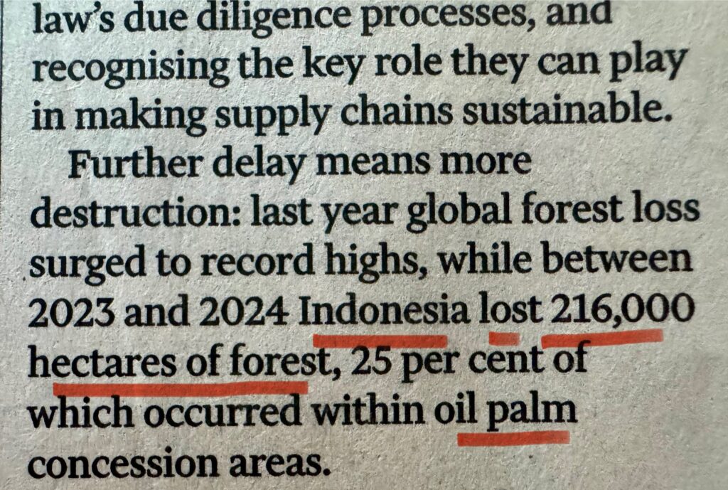 Tra il 2023 e il 2024 l’Indoneisa ha perso 216’00 ettari di foreste, dei quali il 25% per la coltivazione dell’olio di palma