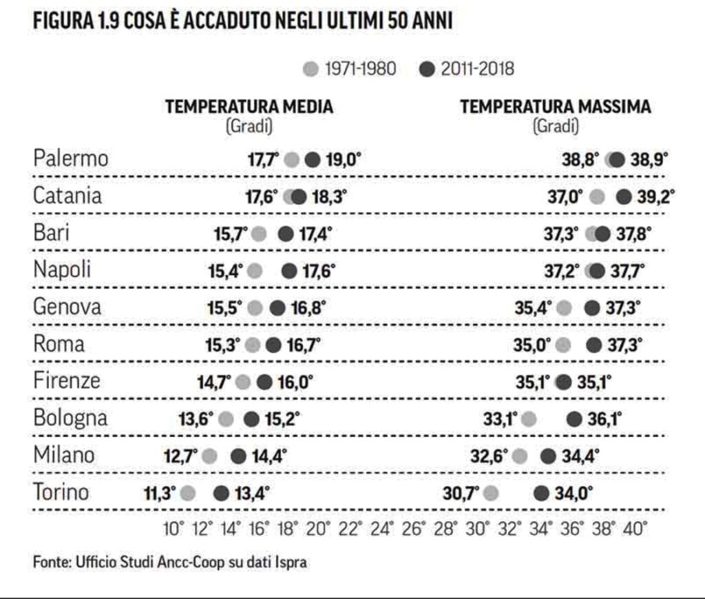 Evidenzia il cambiamento climatico . A Milano: dal 1980 sono salite di quasi 2 gradi. Le minime sono a +1,7° e le massime a +1,8°. Dati ISPRA, Coop. 2018