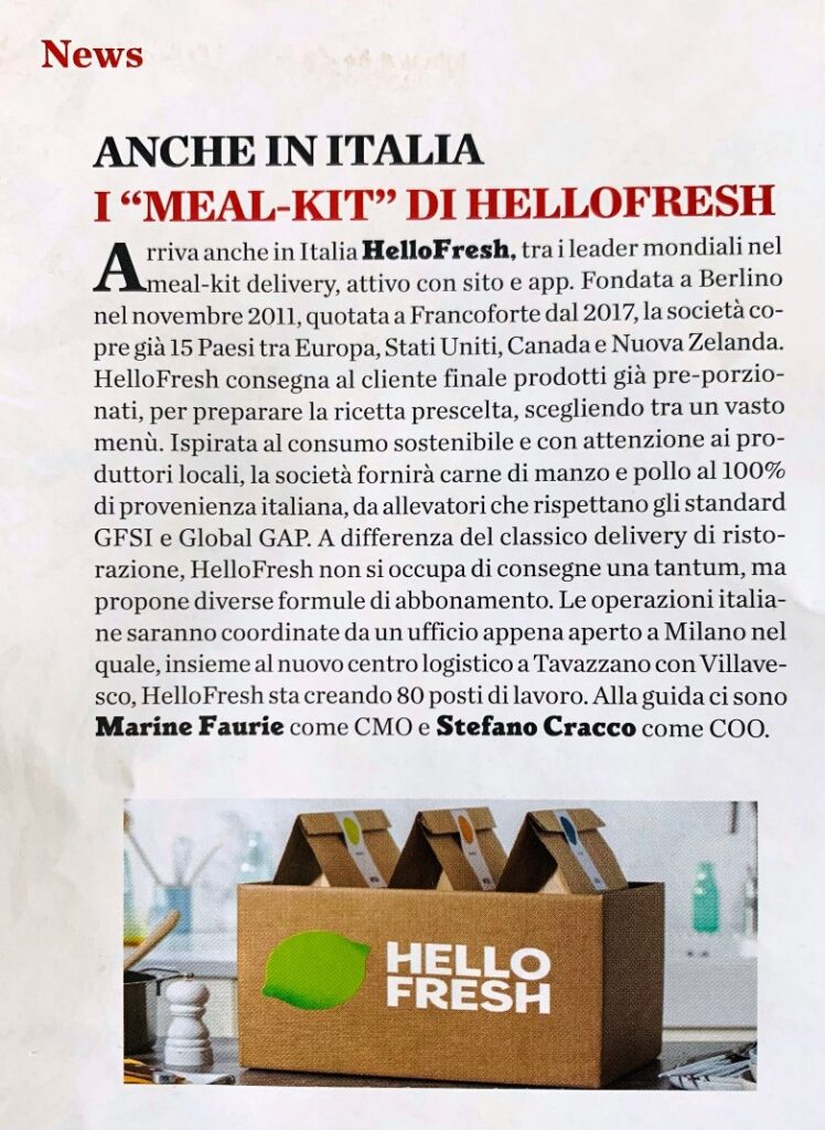 Wonder Group, società di food tech fondata dall’ex dirigente dell’e-commerce di Walmart Marc Lore, ha annunciato l’avvio dell’acquisizione dell’azienda di meal kit Blue Apron per circa 103 milioni di dollari, una cifra inferiore di quanto valeva quando si è quotata in borsa nel 2017, andando così a concludere la tumultuosa cavalcata post-IPO. L’operazione di concluderà nel quarto trimestre del 2023. Fruitbook Magazine 6 ottobre 2023. In Italia , due anni fà, era sbarcata la società di meal kits Hello Fresh