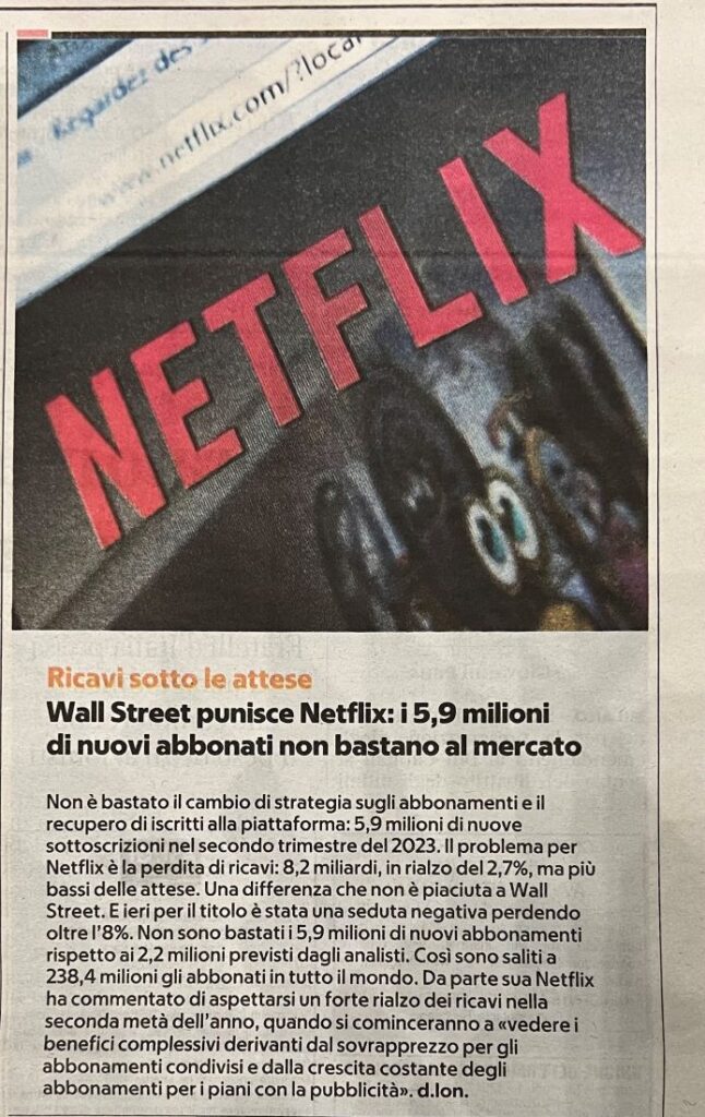 Un giro di vite sulla condivisione delle password ha aiutato Netflix ad aggiungere quasi 6 milioni di abbonati, più del doppio di quanto previsto dagli analisti e convalidando la strategia dello streamer per sostenere la sua attività. Negli Stati Uniti, Netflix ha detto ai clienti che se vogliono condividere la loro password, devono pagare $ 7,99 al mese per aggiungere una persona fuori casa, o $ 6,99 se sono disposti ad avere un account con pubblicità. Aggiornato il 21 luglio 2023 con l’articolo di Repubblica