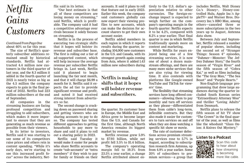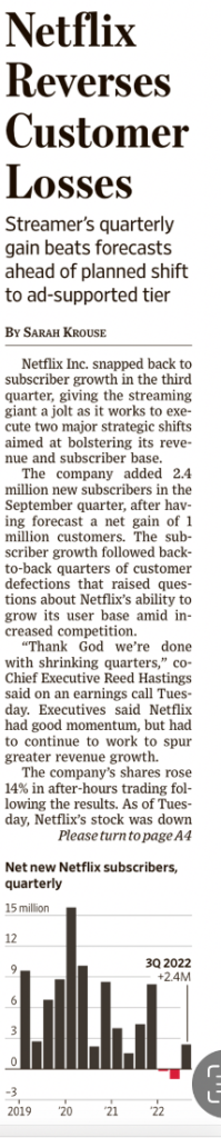 WSJ 19 10 2022. Dal 3 novembre Netflix avrà una formula “meno cara” (5,99 € al mese contro gli 8,99 € della formula “essenziale”), con pubblicità che su video dovrebbe raggiungere, nel 2022, un fatturato pari a 95 miliardi di $ (Le Monde 15 ottobre 2022).