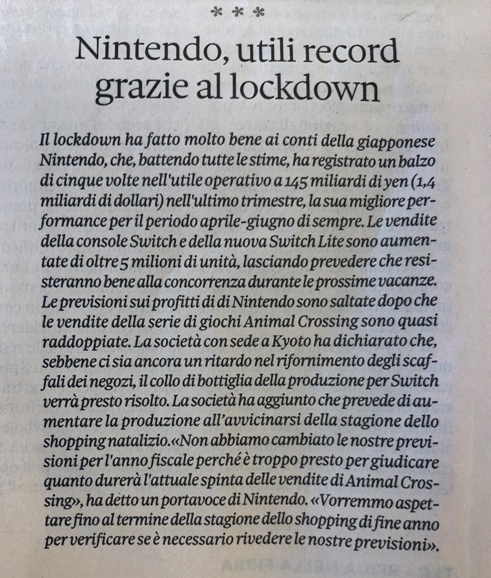 Il Sole 24 ore del 7 agosto 2020. Tutto il comparto dei videogiochi è stato favorito dal lockdown, con 2,7 miliardi di utilizzatori e infatti Sony vi ha investito in Epic Games (Fortnite).