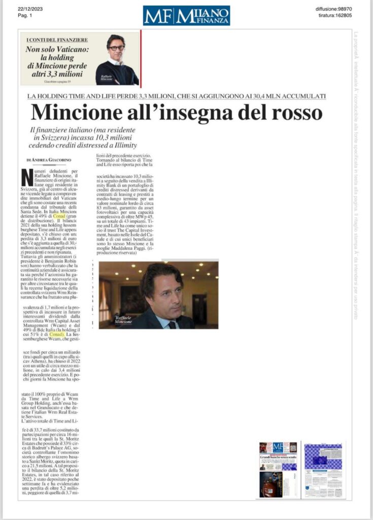 Oltre alla condanna a 5 anni e 6 mesi e al sequestro pari a 172 milioni e 360 mila euro le sue holding sarebbero in perdita per 3,3 milioni di €. MF 22 dicembre 2023. Leggi anche : Auchan-Conad-Raffaele Mincione CHE STRANA TRIANGOLAZIONE. A proposito di giornalisti, cooperative e sindacati