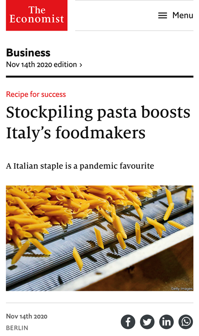 I consumi di pasta nel mondo sono saliti dal 1999 al 2019 da 7milioni di t a 16 milioni di t. The Economist 14 novembre 2020