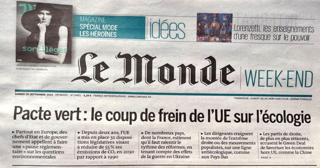 La UE da due anni a questa parte ha varato 32 leggi per frenare le emissioni di CO2 (- 55% entro il 2030).Molti paesi – tra i quali la Francia – vogliono rallentare questo percorso per paura di perdere le elezioni contro il centro destra che accusa il Green Deal di favorire la Cina. Le Monde 30 settembre 2023