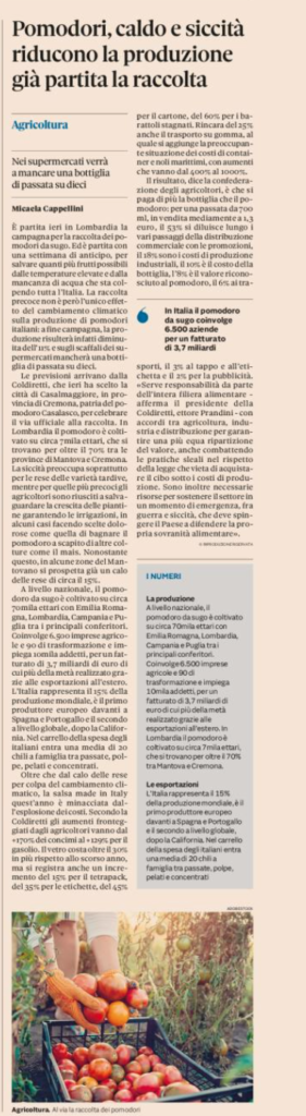 Pomodoro : mancherà 1 bottiglia di passata su 10 a causa della siccità