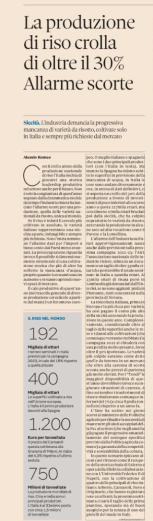 a causa soprattutto della siccità. Il Sole 24 ore del 15 ottobre 2022. Crisi climatica: la siccità minaccia il riso e la ricerca si muove verso nuove tecniche e varietà