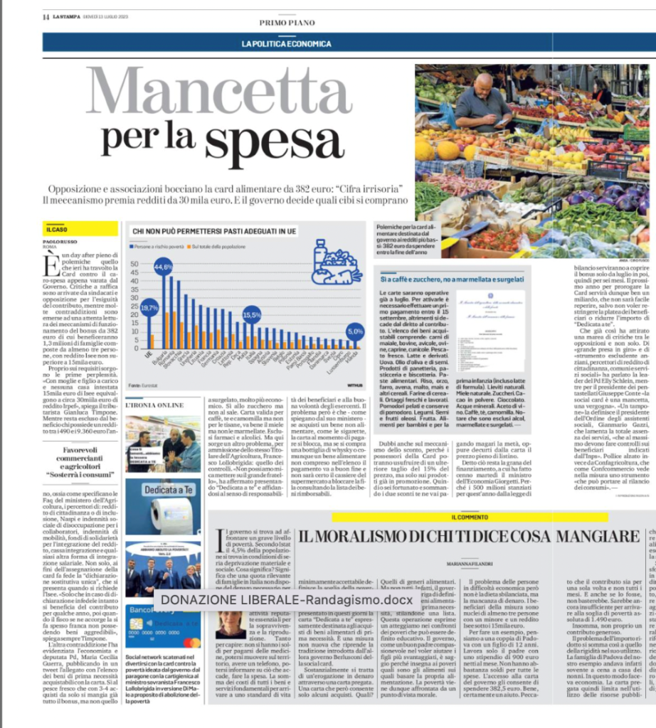 favorevoli commercianti e Coldiretti. La Stampa 13 Luglio 2023. Criticata la “mancia di Stato” che statuisce cosa si può mangiare e cosa no. Per capire meglio leggi qui