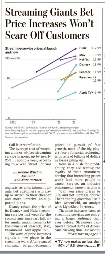 Disney, ad esempio, le ha già aumentate due volte quest’anno. Lo streaming ha pesato quasi il 40% il mese scorso negli USA. I vari attori sperano che i clienti non scappino ma hanno dovuto adeguarle a causa dei rialzi dei tassi di interesse. WSJ 16 agosto 2023