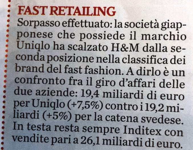 Inditex (vari marchi tra i quali Zara) a 26,1 miliardi di €, Fast Retailing (Uniqlo e altri marchi) a 19,4 miliardi di €, H&M a 19,2. Retail & Food Novembre 2019. Uniqlo ha aperto a Milano.