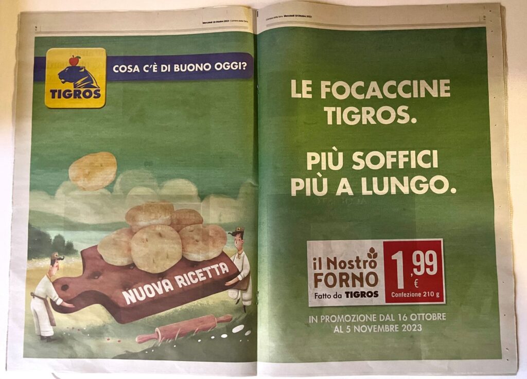 Pubblicità Corriere. Sull’ideazione e il lancio delle focaccine da parte del signor Marino Fineschi, citato in Le ossa dei Caprotti, leggi qui. Tigros ha spesso prodotti “non all’altezza, soprattutto in frutta e verdura” quindi siamo curiosi di provarle.