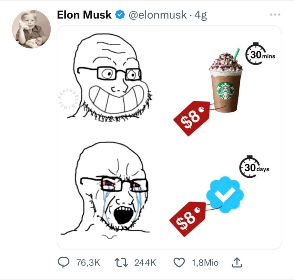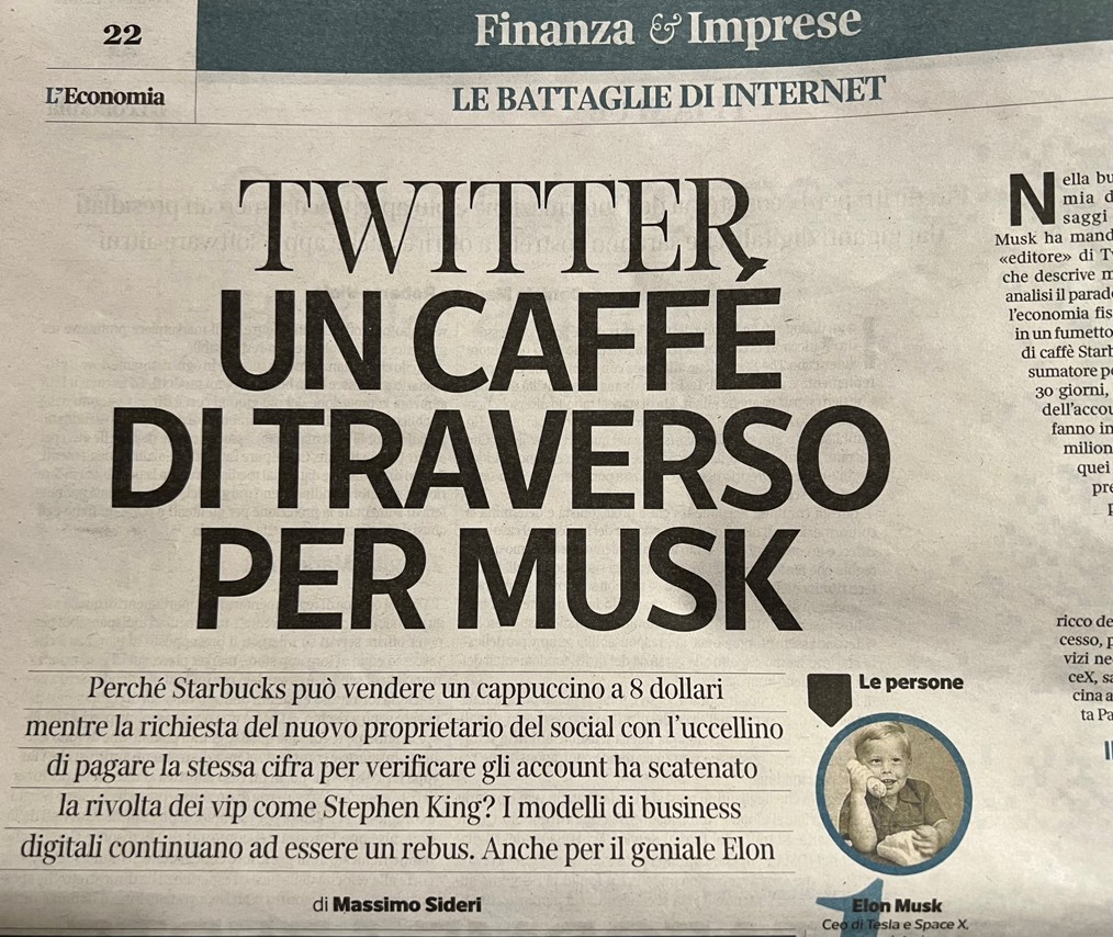 Il Corriere Economia racconta oggi la storia dello stupore di Elon Musk per la rivolta sul web contro gli 8 $ che vorrebbe far pagare per la spunta blu di Twitter. L’equivalente di un caffè da Starbucks. Musk non sa che se i clienti hanno avuto un prodotto “gratis” (che poi lo sia veramente è un’altra storia..) è praticamente impossibile tornare indietro. In Esselunga era successo con i sacchetti di plastica. Fù un tormentone per mesi : i clienti non ne volevano sapere di pagarli. Sotto : i titoli del quotidiano ed il tweet di Musk.