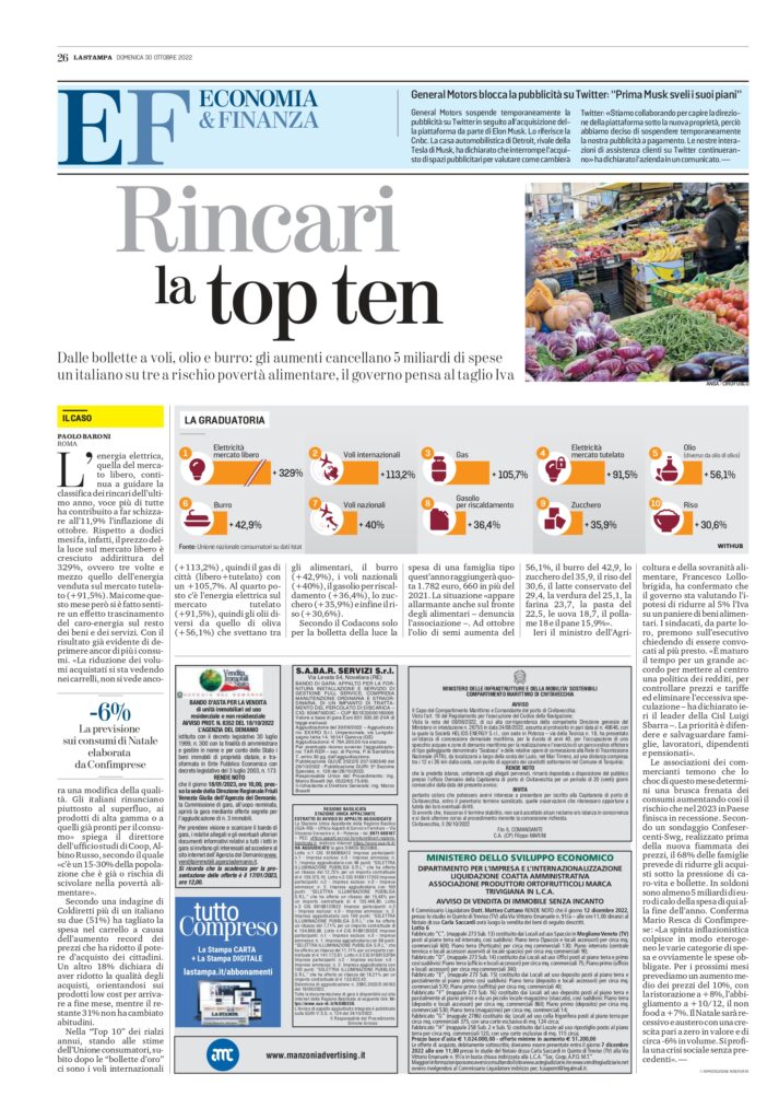 Nella top ten dei rincari alcuni prodotti alimentari . La Stampa 31 Ottobre 2022