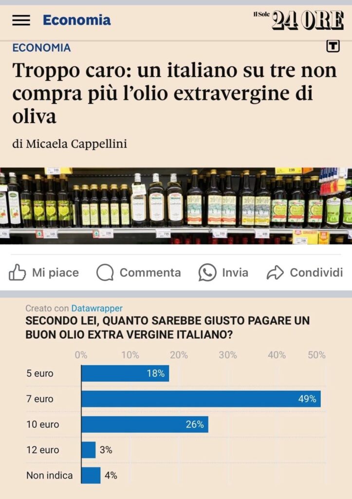 Non compra più a causa dell’inflazione causata dal cambiamento climatico (la siccità in Spagna ha fatto andare alle stelle il prezzo). Il Sole 24 ore. Sull’olio extravergine puoi leggere questo articolo